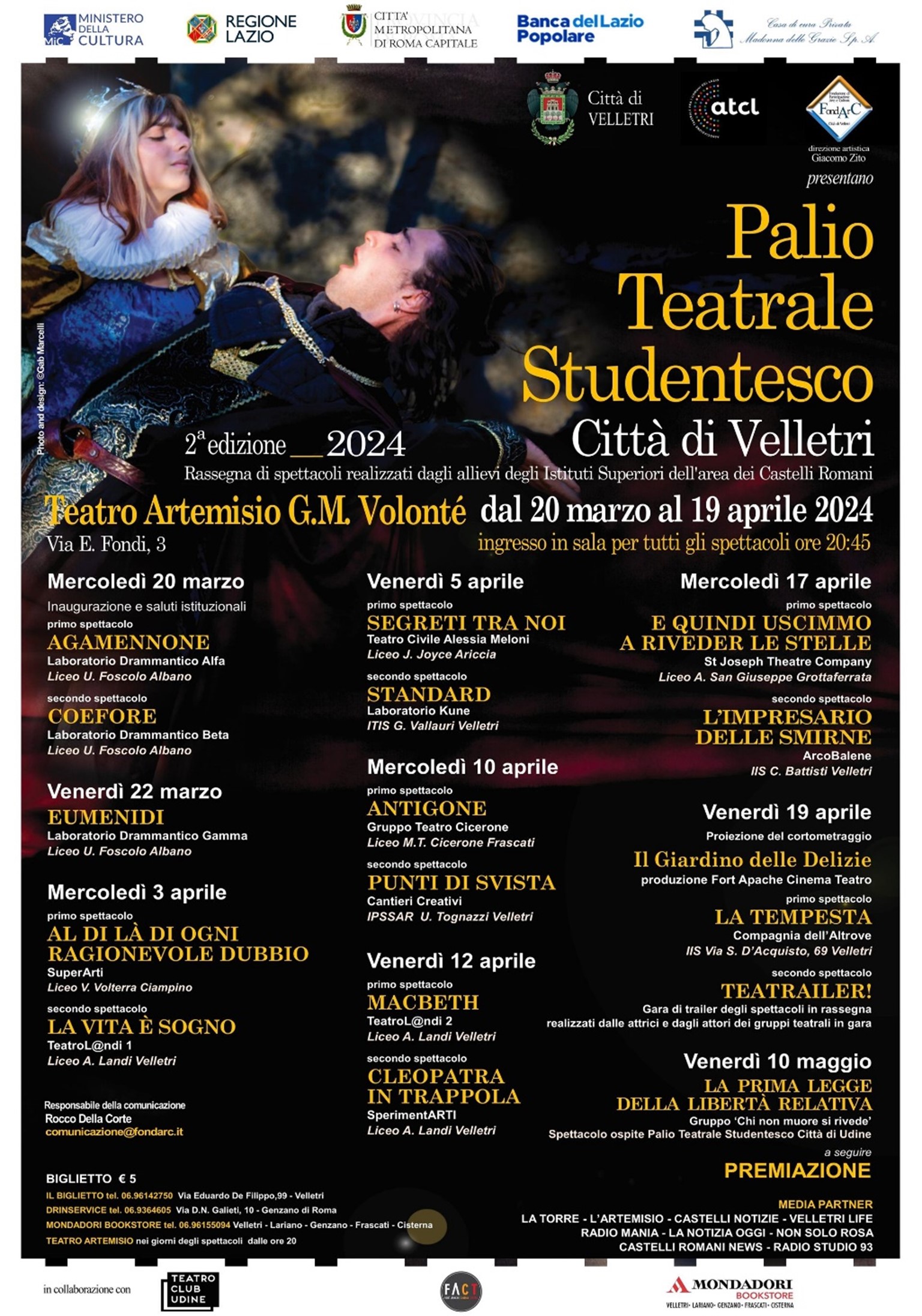 Mercoledì 20 marzo in scena “Agamennone” e “Coefore”, a cura dei Laboratori Drammantico Alfa e Beta del Liceo “Ugo Foscolo” di Albano. Prima della doppia esibizione il taglio del nastro e i saluti istituzionali da parte di Fondarc, Comune di Velletri, Regione, ATCL. Venerdì 22 marzo, invece, il Laboratorio Drammatico Gamma del “Foscolo” porterà sul palco veliterno “Eumenidi”. Si tornerà poi in sala mercoledì 3 aprile, con “Al di là di ogni ragionevole dubbio” del Laboratorio SuperArti del Liceo “Vito Volterra” di Ciampino e con “La vita è sogno” del Laboratorio TeatroL@ndi del Liceo Scientifico “Ascanio Landi” di Velletri. Venerdì 5 aprile, invece, “Segreti tra noi” del Laboratorio di Teatro Civile Alessia Meloni del Liceo “James Joyce” di Ariccia e “Standard” del Laboratorio Kune dell’ITIS “Giancarlo Vallauri” di Velletri. Mercoledì 10 aprile sarà la volta di “Antigone” del Gruppo Teatro Cicerone del Liceo “Cicerone” di Frascati e di “Punti di svista” di Cantieri Creativi dell’IPSSAR “Ugo Tognazzi” di Velletri. Venerdì 12 aprile la programmazione propone “Macbeth” a cura di TeatroL@andi e “Cleopatra in trappola” del Laboratorio SperimentArti, entrambi con gli studenti del Liceo Scientifico “Ascanio Landi” di Velletri. Mercoledì 17 aprile in scena “E quindi uscimmo a riveder le stelle” di St Joseph Theatre Company del Liceo “San Giuseppe” di Grottaferrata e “L’impresario delle Smirne” del Laboratorio Arcobalene dell’IIS “Cesare Battisti” di Velletri. L’ultima serata del Palio è prevista per venerdì 19 aprile, e sarà introdotta dalla proiezione de “Il giardino delle delizie” a cura di Fort Apache Cinema Teatro, ente organizzatore del progetto che coinvolge detenuti o detenuti in misura alternativa (semilibertà, affidamento ai servizi sociali, affidamento in centri di prevenzione alla tossicodipendenza, detenzione domiciliare, etc..), che hanno intrapreso un percorso di professionalizzazione e inserimento nel sistema dello spettacolo, partecipando a diverse produzioni teatrali, televisive e cinematografiche. A seguire “La tempesta” della Compagnia dell’Altrove dell’IIS “Via Salvo d’Acquisto, 69” di Velletri e il “Teatrailer”, gara di trailer degli spettacoli in rassegna realizzati da attori e attrici in gara che avranno a disposizione un tempo di pochi minuti per sintetizzare il proprio lavoro a chiusura del Palio. Tutte le serate avranno inizio alle 20.45, con l’apertura del foyer e della biglietteria a partire dalle 20.