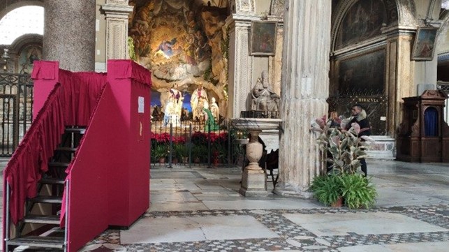 Fra tutte le magnifiche opere d’arte, altari e cappelle, troviamo – custodita in una teca in una cappella – il Santo Bambinello (quella che vediamo è una copia dell’originale rubata nel 1994). La statuetta (alta 60 centimetri) è una delle immagini più sacre di Roma: “Er pupo de Roma” – come viene chiamato dai romani – è considerato in grado di guarire i malati più gravi.