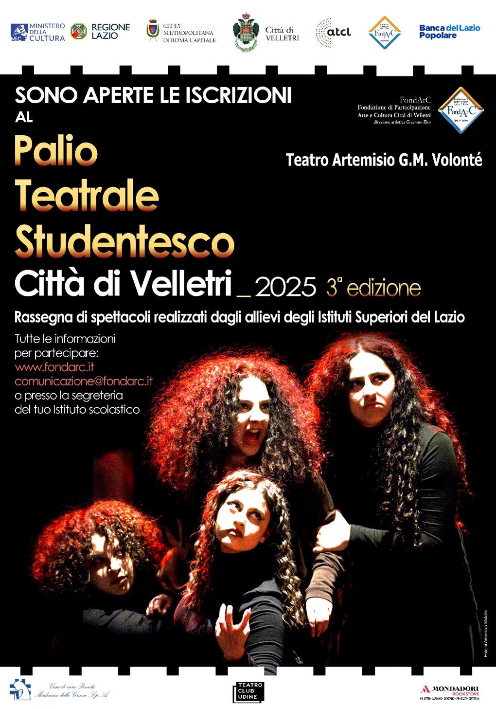 Dopo il successo indiscusso delle prime due edizioni, ecco l’attesissima terza stagione del Palio Teatrale Studentesco “Città di Velletri” – rassegna di spettacoli a cui possono partecipare gli allievi di tutte le scuole di Istruzione Secondaria di Secondo Grado del territorio – organizzato dalla Fondazione di Partecipazione Arte & Cultura Città di Velletri diretta da Giacomo Zito, realizzato dal Comune di Velletri, con il patrocinio di Ministero della Cultura, Regione Lazio, Città Metropolitana di Roma Capitale, la collaborazione di ATCL (Associazione Teatrale Comuni del Lazio) del Teatro Club di Udine e Mondadori Bookstore Velletri, e il contributo di Banca Popolare del Lazio.